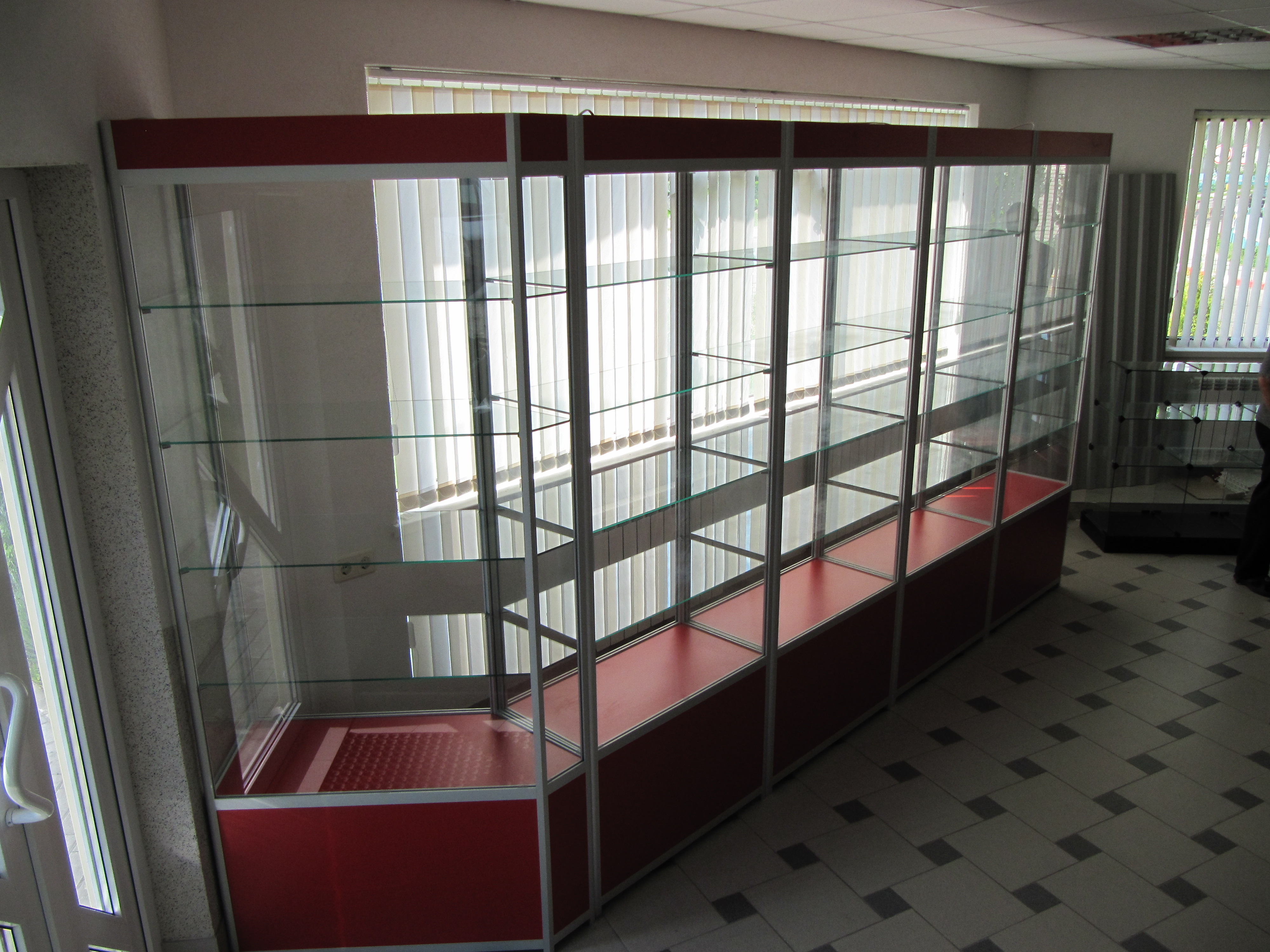 Материал: Алюминиевый профиль системы «Euroshop». ДСП ламинированная, толщиной 18 мм.