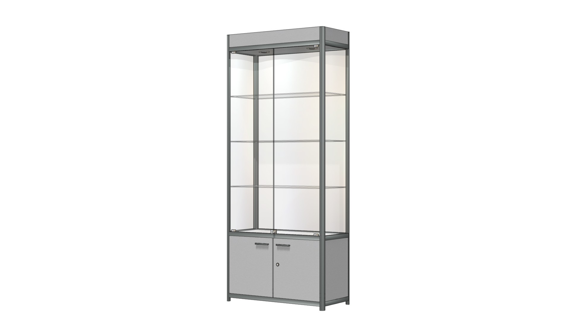 Витрина из алюминиевого профиля ВП2 представляет собой универсальное торговое оборудование с высокими демонстрационными характеристиками благодаря панорамному остеклению фасада и боковых частей. Имеет размеры: 900х400х2100. Предлагается в коллекции «EuroShop».