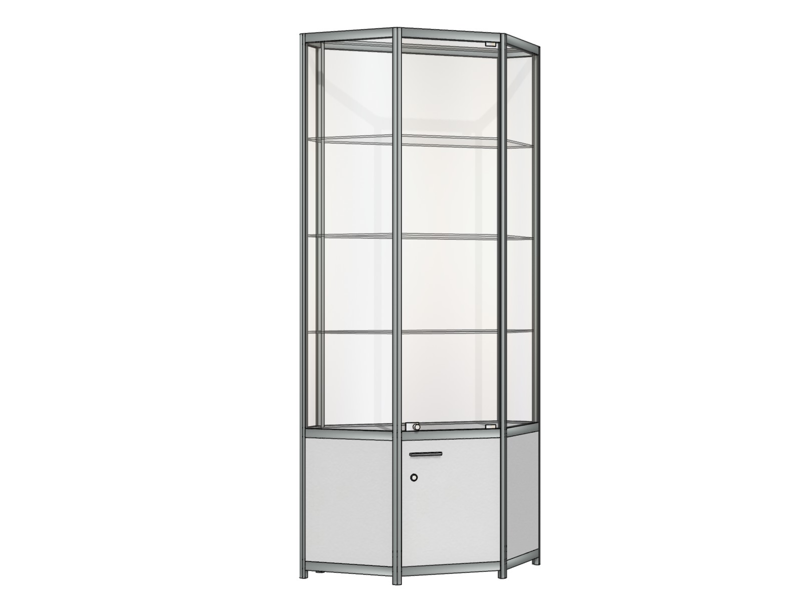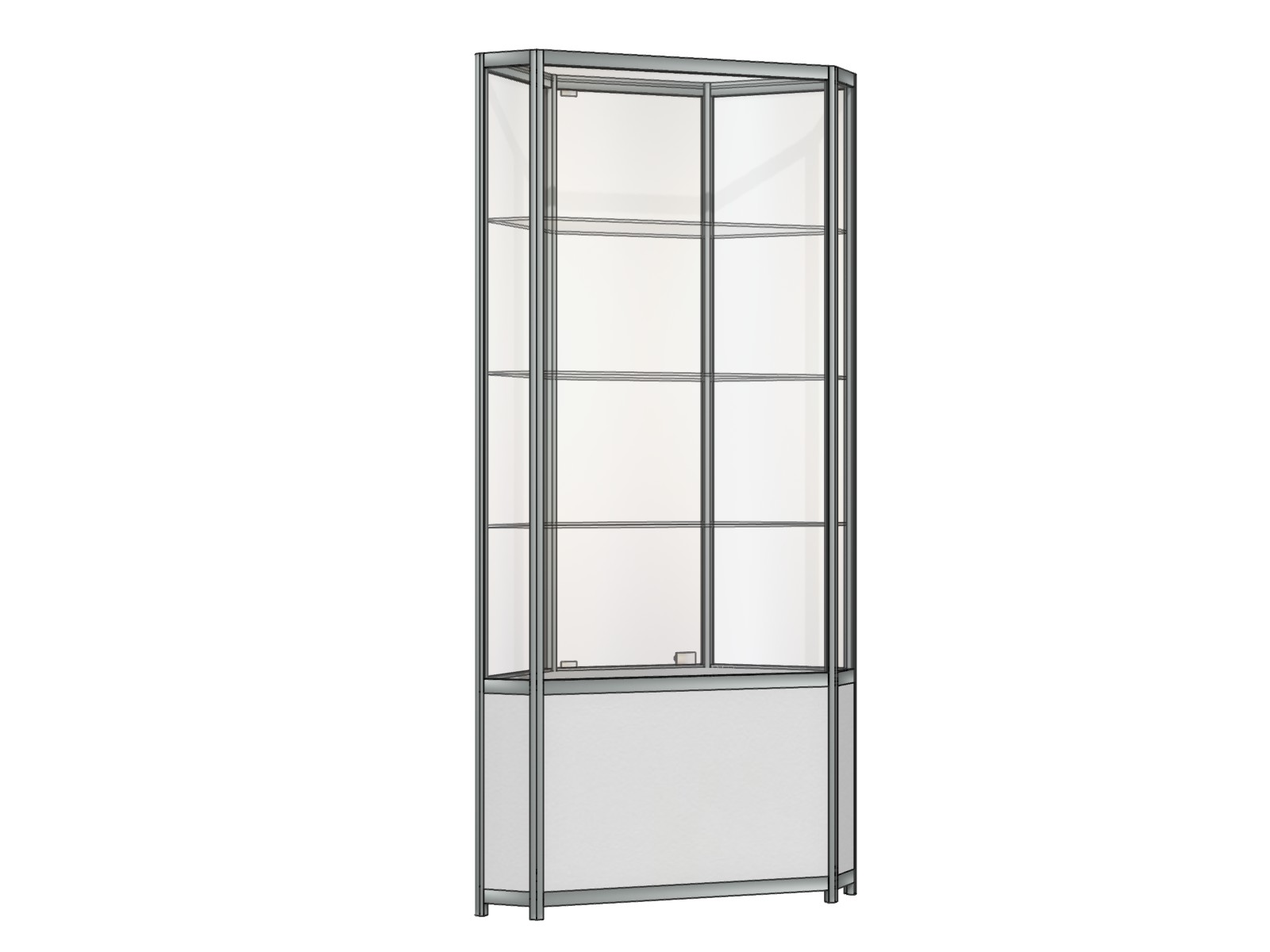 Материал: Алюминиевый профиль системы «Euroshop». ДСП ламинированная, толщиной 18 мм. Цвет – Серый пепел. Боковое остекление – стекло 4 мм. Двери – стекло 5 мм. Полки – стекло 6 мм. Без подсветки.