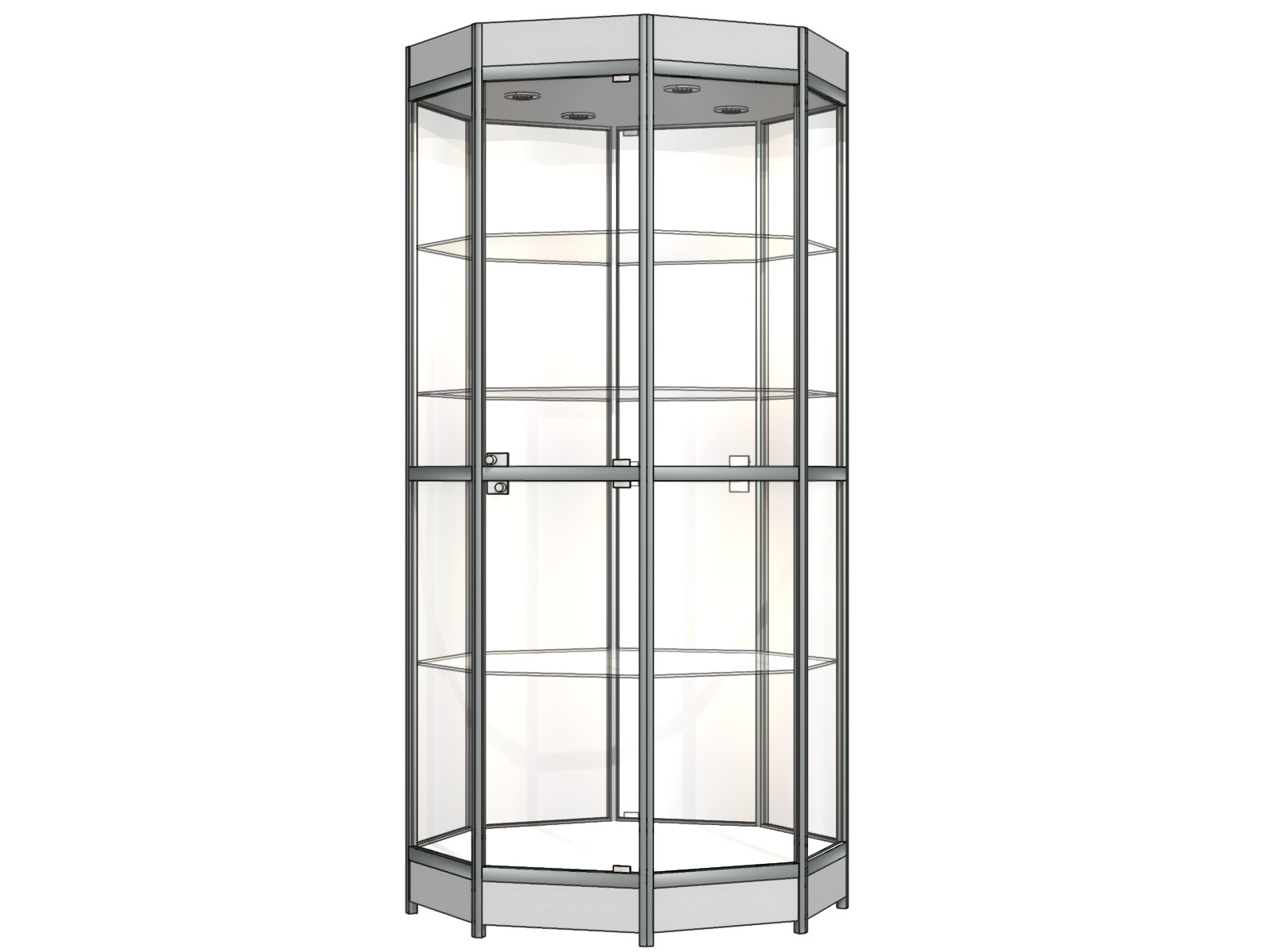 Материал: Алюминиевый профиль системы «Euroshop». ДСП ламинированная, толщиной 18 мм. Цвет – Серый пепел. Боковое остекление – стекло 4 мм. Двери – стекло 5 мм. Полки – стекло 6 мм.