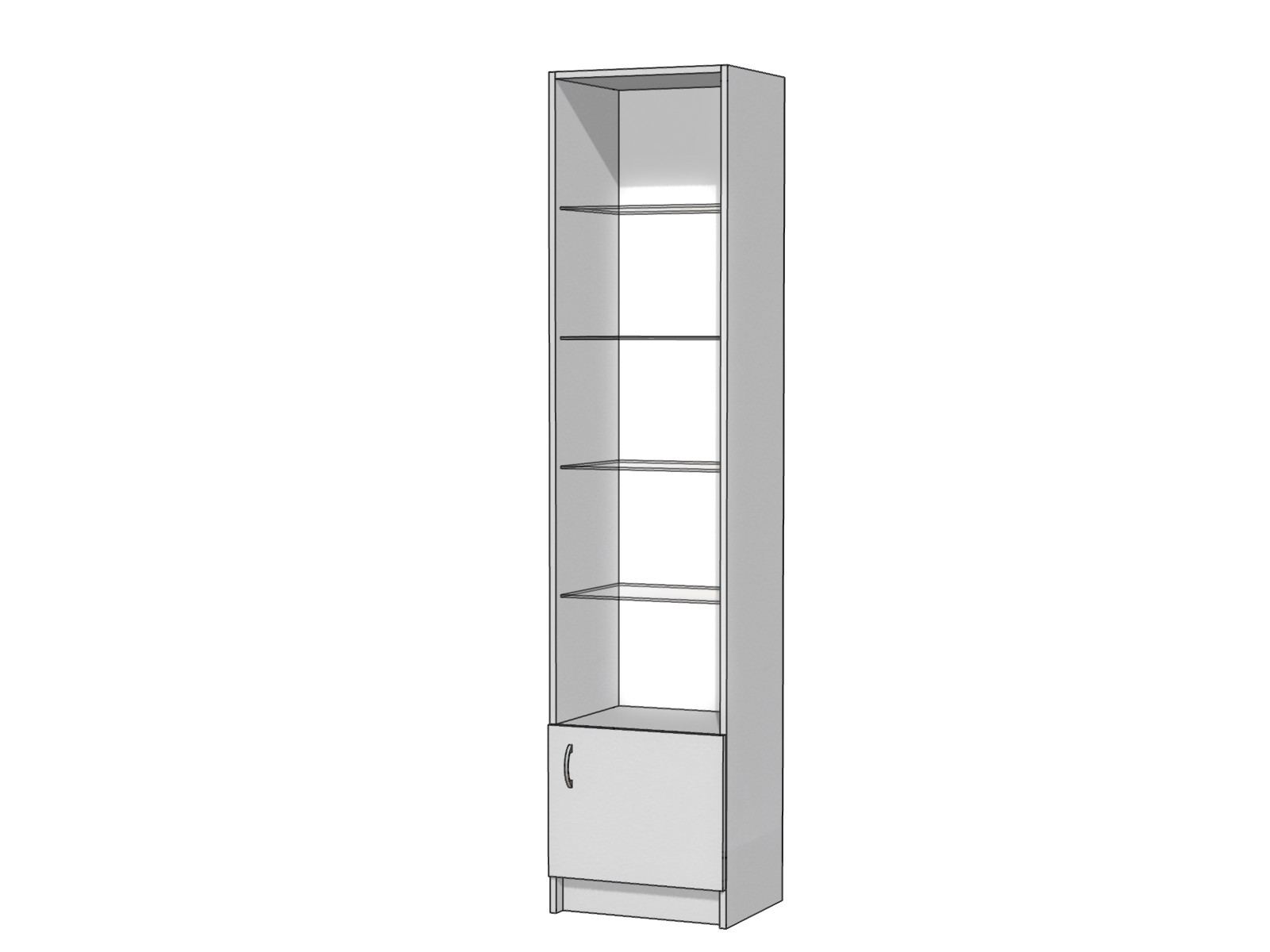Стеллаж имеет 5 отсеков в верхней части, предназначенных для демонстрации товаров. В нижней части имеется закрытый отсек для хранения.