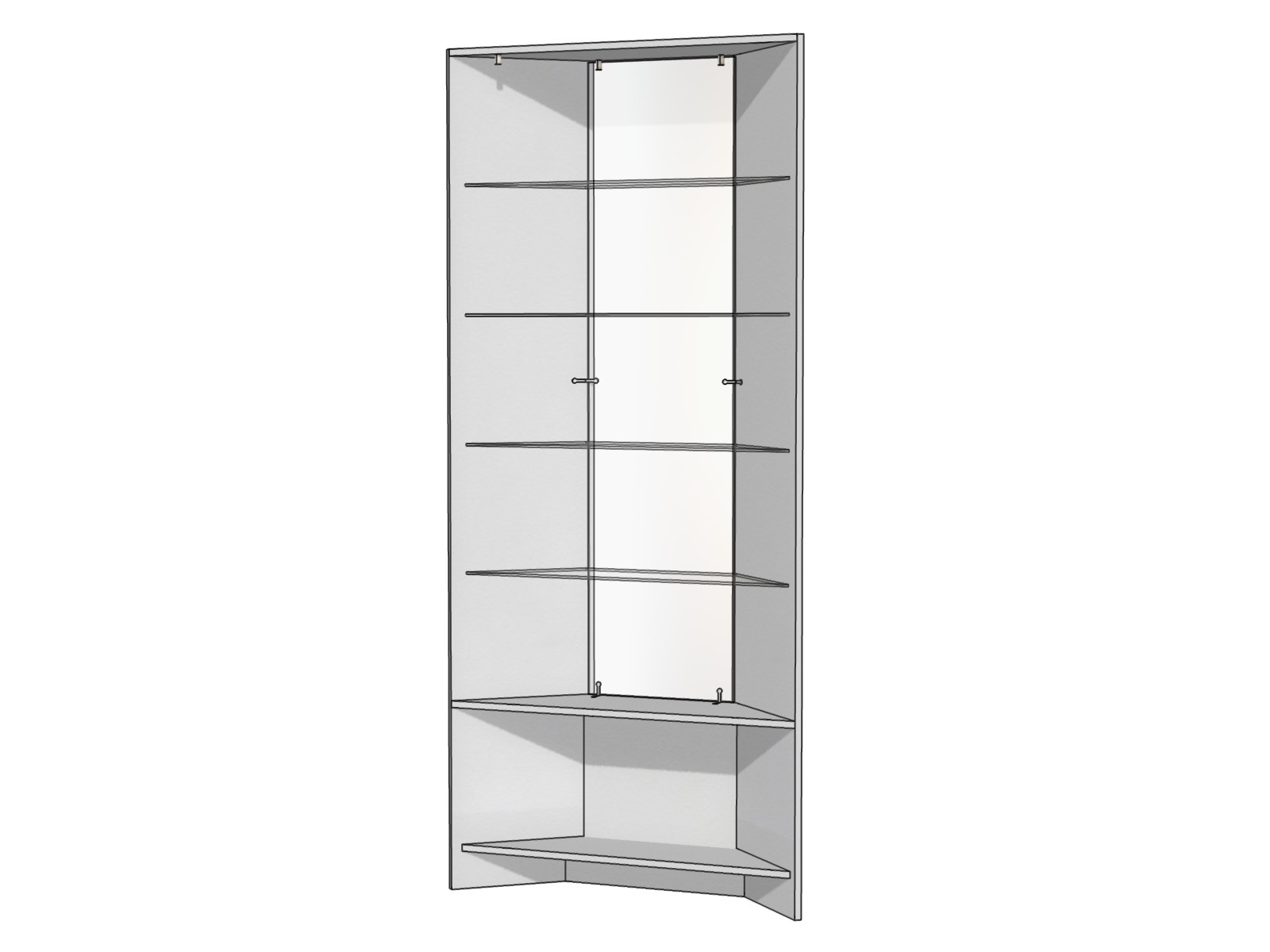 Размер стеллажа – 700х700х2200, он позволит разместить товар на нескольких уровнях. Его полки прочные, выполнены из надежного ДСП, применяется каленое стекло.