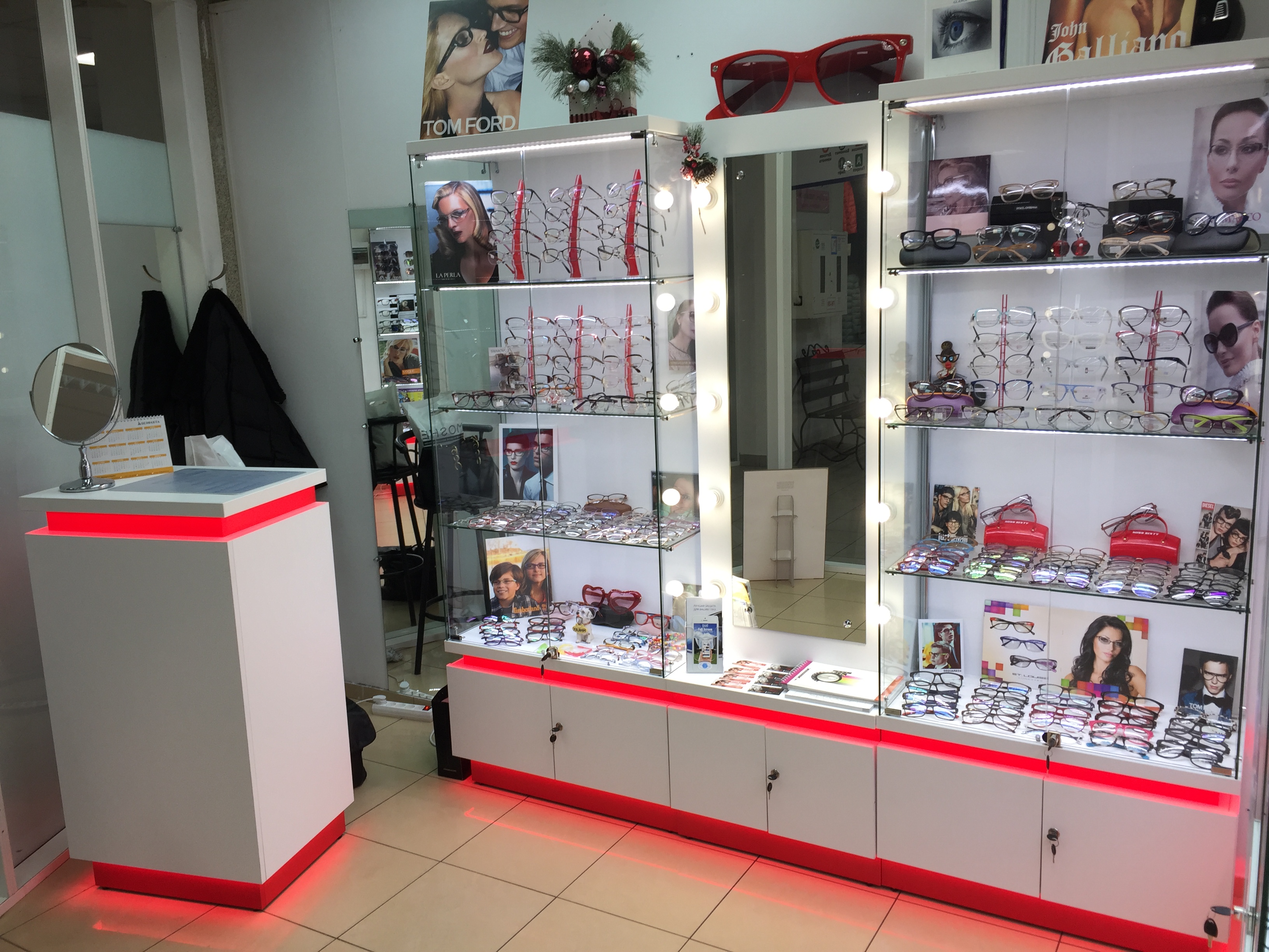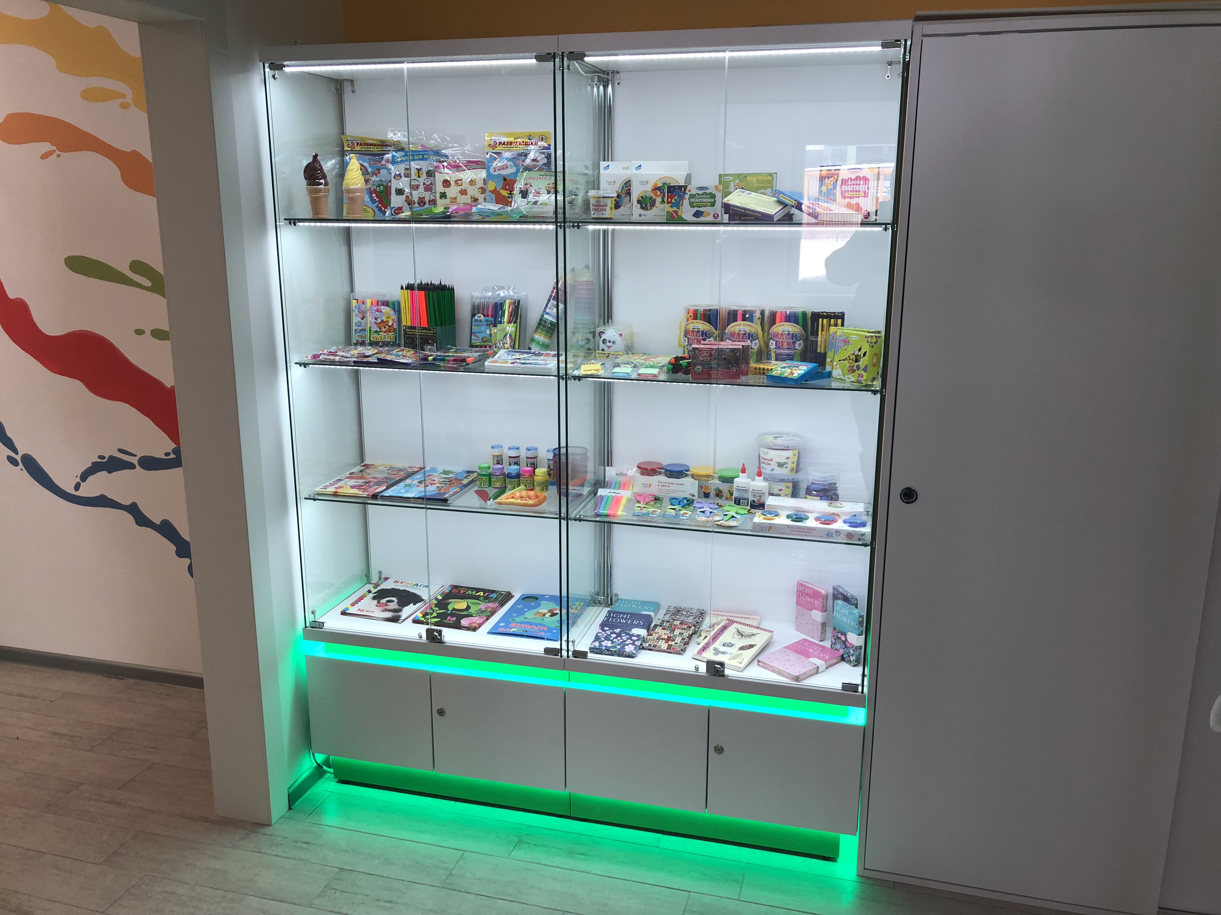 Вы сможете использовать как недорогой точечный светильник, так и многоцветную светодиодную ленту в зависимости от собственной фантазии и средств, которые вы планируете потратить на обеспечение магазина торговым оборудованием. Для подсветки предусмотрены специальные трубы, в которых можно спрятать провода, на них можно закрепить сами светильники. Подсветку можно размещать как под каждой полкой в горизонтальном положении, так и использовать ее вертикальный вариант.