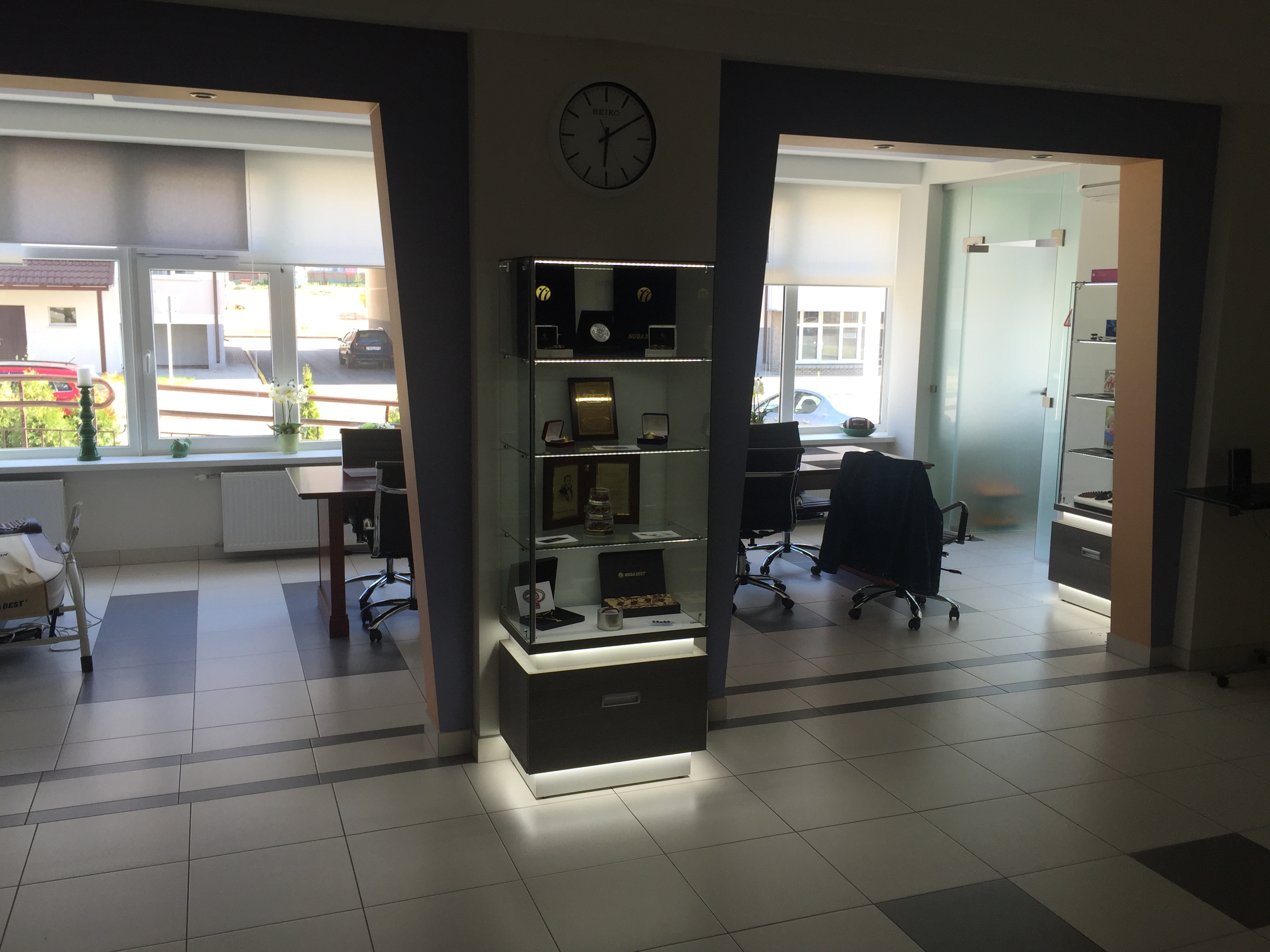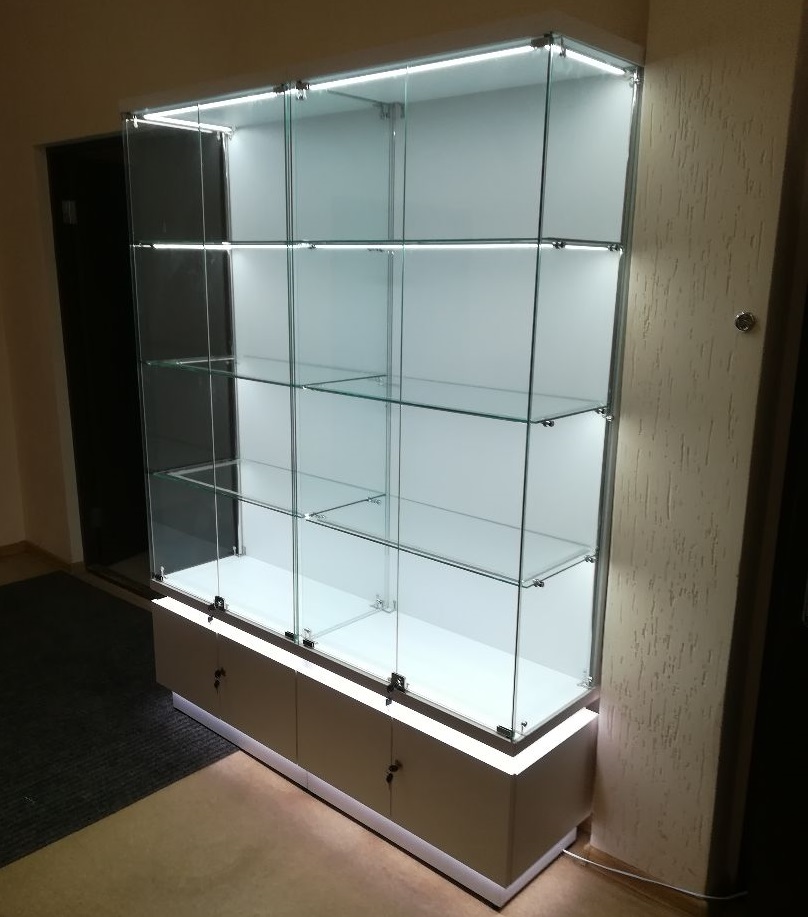 Стоит обратить внимание на то, что при изготовлении продукции используется высокопрочное стекло. Несмотря на визуальную легкость, мебель обладает надежностью, которой может позавидовать традиционный прочный материал. Для привлечения внимания покупателя можно использовать разнообразную подсветку, она не только выгодно продемонстрирует товар, но и украсит саму витрину, сделав ее более заметной и привлекательной.