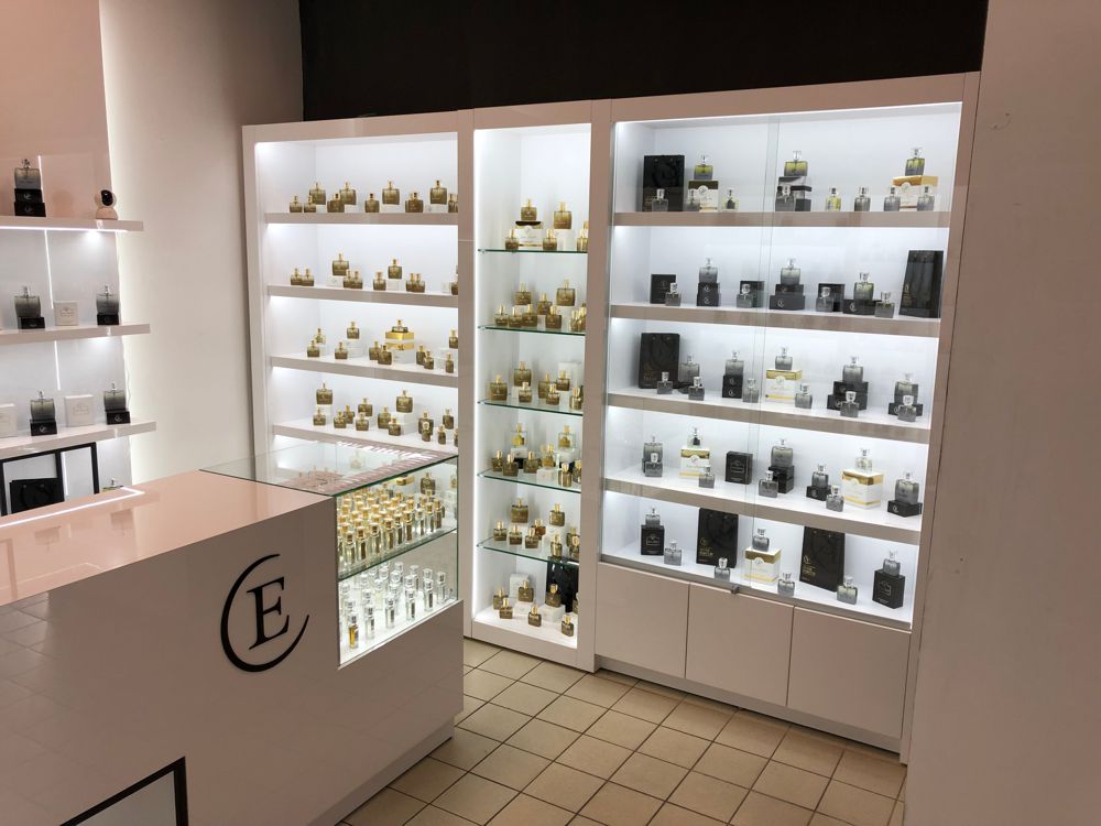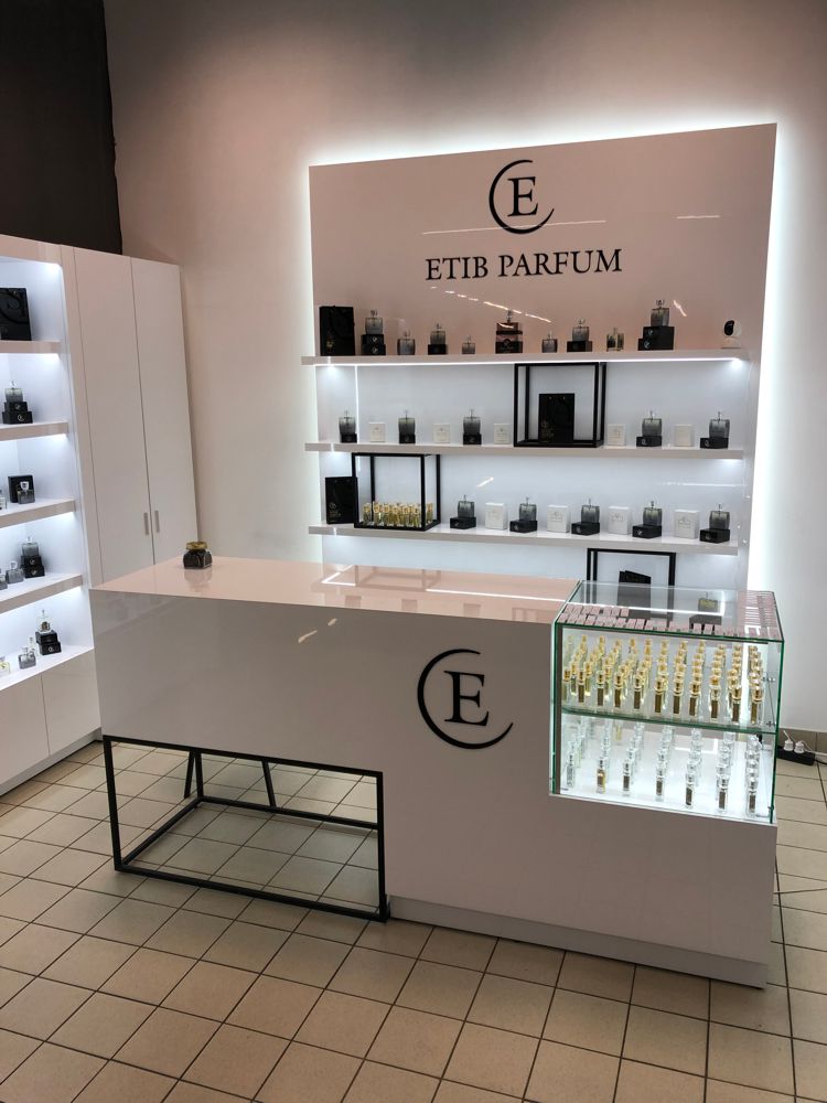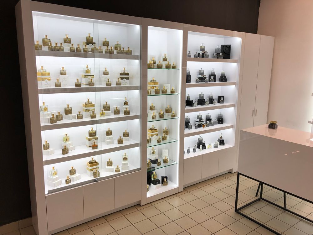 Попадая в этот бутик, покупатель попадает в храм чистоты и света. Глянцевая поверхность мебели создаёт впечатление роскоши и богатства. Чёрные кубы в стиле лофт создают контрастные акценты и делают картину законченной. Мягкий свет, струящийся из ниш, радует глаз и создаёт подходящее настроение для путешествия в мир волшебных ароматов.