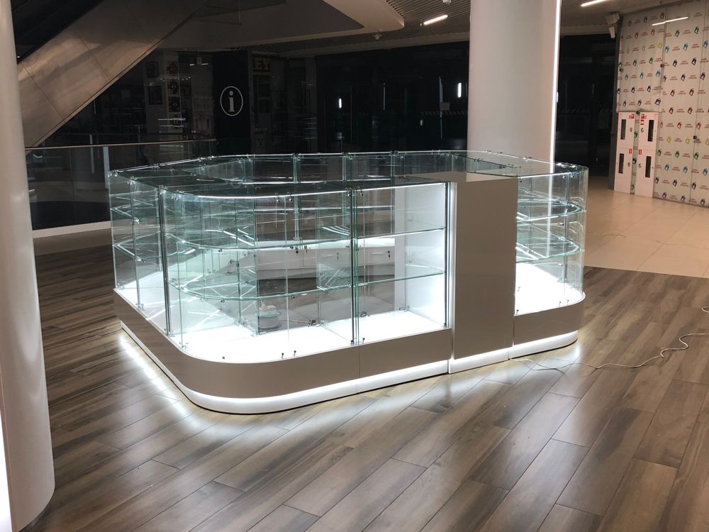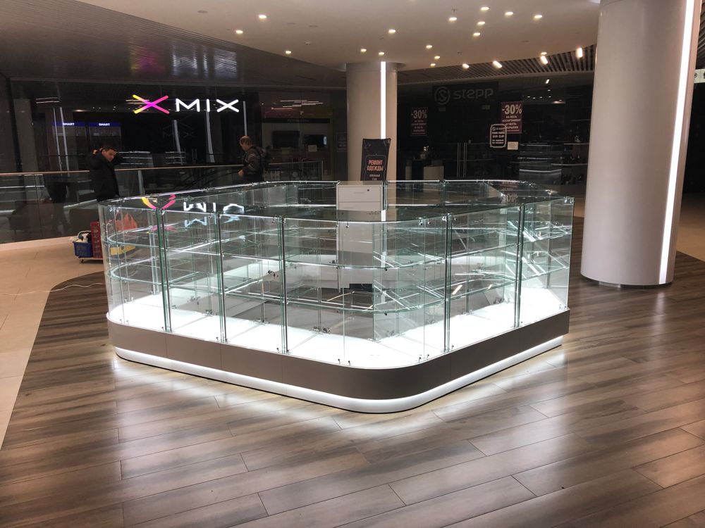 Пятиугольная причудливая форма островка призвана поддержать архитектурные особенности изысканного интерьера торгового центра. Представительность и дороговизну товара подчёркивает глянцевый блеск наружных деталей тумб-подиумов, а подсветка цоколя скользящим светом создаёт эффект парения островка в воздухе.